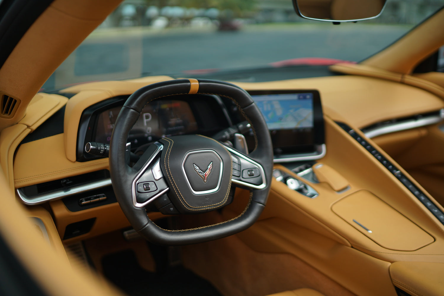 The Corvette Stingray’s interior is as luxurious as it is sporty, featuring rich tan leather seats that provide comfort for both driver and passenger. The cockpit is driver-focused, putting you in complete control with every detail designed to enhance your driving experience.