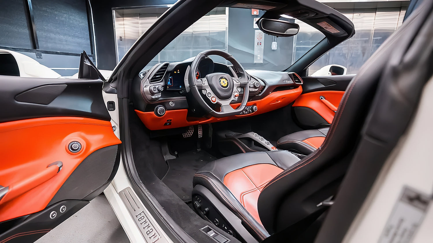The cabin of this Ferrari 488 Spider is a blend of sporty design and luxury. The unique red and black leather seats provide comfort and support, while the steering wheel and controls are perfectly positioned for quick maneuvers, putting you at the center of the unique driving experience.