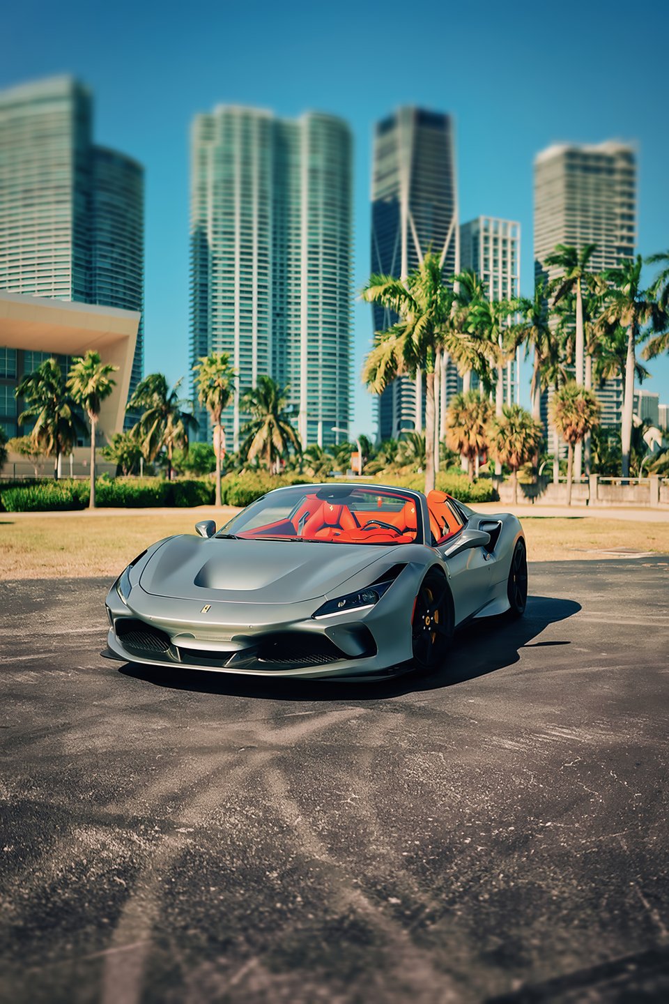 Set against Miami's iconic palm trees and azure skies, the Grigio Silverstone finish creates a stunning contrast with the Rosso interior. Every curve and surface serves both form and function, from the S-Duct front design to the blown spoiler system. The LED matrix headlights cut through darkness with precision, while the distinctive side intakes feed air to the most powerful V8 in Ferrari's history. The retractable hardtop maintains the F8's perfect proportions whether open or closed.