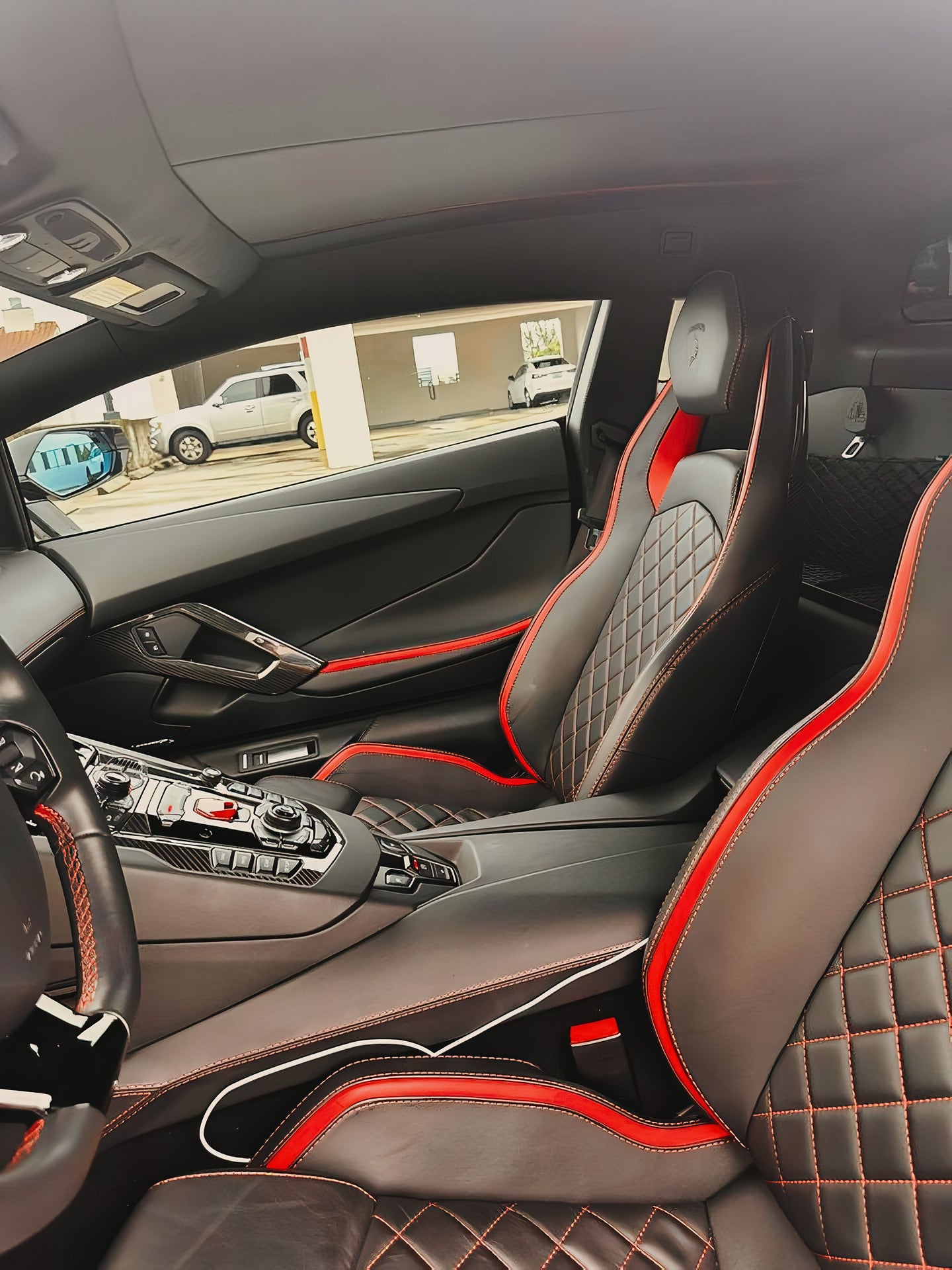 Inside, it’s not just about speed, it’s about comfort and style. The sleek black leather with red stitching screams sophistication, while the carbon fiber touches remind you that this car means business. Everything’s laid out perfectly to give you control, but it still wraps you in that signature Lambo luxury